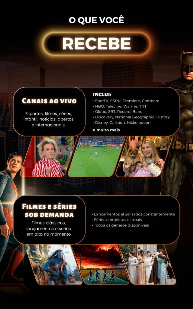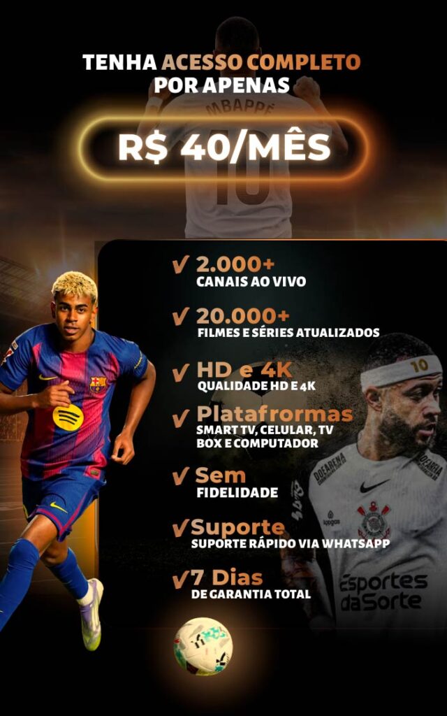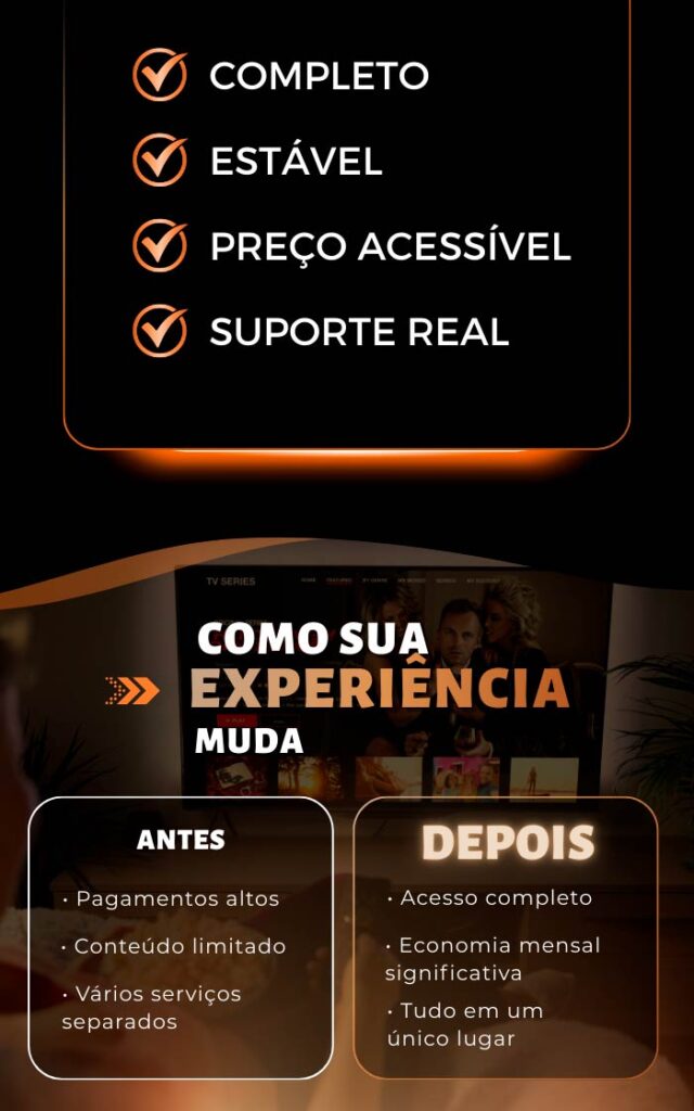 Funciona perfeitamente em: celular Android/iOS, tablet, computador, TV Box, Fire Stick e Chromecast. Em Smart TVs depende do sistema: TVs com Android TV nativo funcionam direto. Samsung (Tizen) e LG (webOS) podem precisar de instalação manual ou TV Box externo (R$ 100-150). Solução garantida: qualquer TV (até as antigas sem Smart) funciona conectando um TV Box ou Fire Stick. Enviamos tutorial específico pro seu dispositivo.